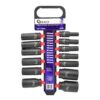 Komplet dolgh 6-kotnih udarnih gedor s priključkom 1/2″ in dolžino 75 mm. Narejeni so iz kakovostnega CrMO jekla in so idealna za uporabo s pnevmatskimi udarnimi vijačniki. Ključi so nameščeni na plastičnem obešalniku in razporejeni po velikosti od 10 do 32 mm.