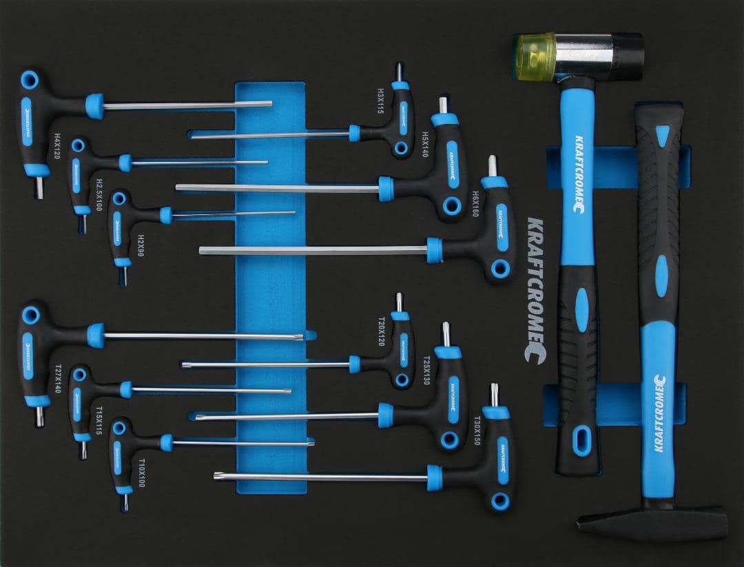 Vsako orodje je varno v svoji vdolbini, ki ga je mogoče enostavno odstraniti zahvaljujoč vdolbinam